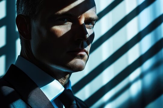 A man in a suit, his face partially obscured by shadows cast by blinds, conveys a sense of mystery and intrigue.
