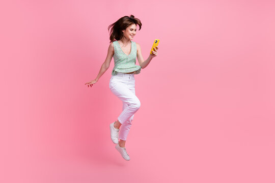 Photo of glad cheerful cute girl wear stylish summer outfit read instagram twitter facebook post isolated on pink color background