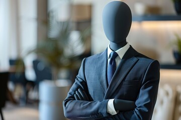 Four stylish invisible persons wearing modern business style outfits and eyeglasses standing against blue background. Concept of fashion, style
