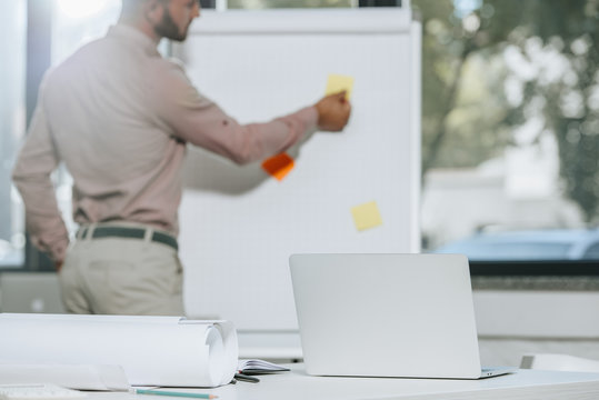 cropped image of businessman preparing for meeting in office with laptop on foreground
