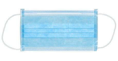 Head shot close up young unhealthy woman in facial medical facemask coughing, responsible for not spreading virus infection, isolated on blue studio background, flu grippe coronavirus quarantine.