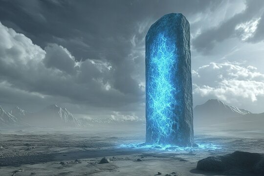 towering alien monolith glowing with blue energy in a barren landscape