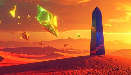 Mysterious alien desert landscape with floating crystals and obelisk.