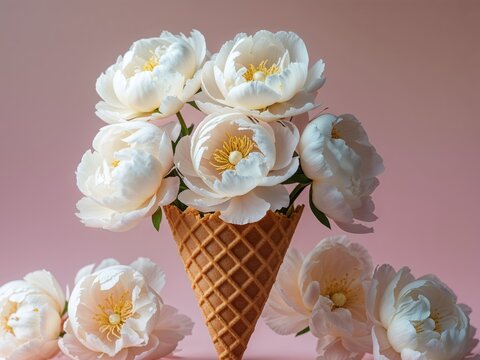 Elegant white peony blossoms arranged in a waffle cone with a soft pink background for a unique spring summer look