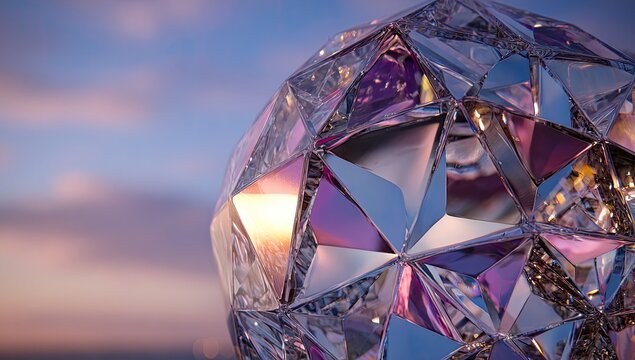 Gemstone sphere with geometric facets reflecting a sunset sky