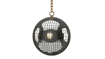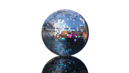 Shiny sphere with mirrored facets reflects colorful lights against a dark background