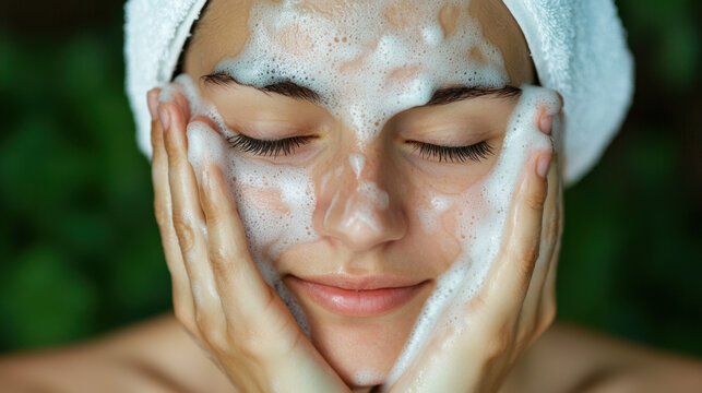 Close-up of a woman's face covered in foamy facial cleanser with eyes closed. Skincare and beauty routine.
