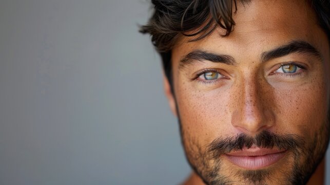 Man inspecting hair and skin in stylish bathroom for self-care routine