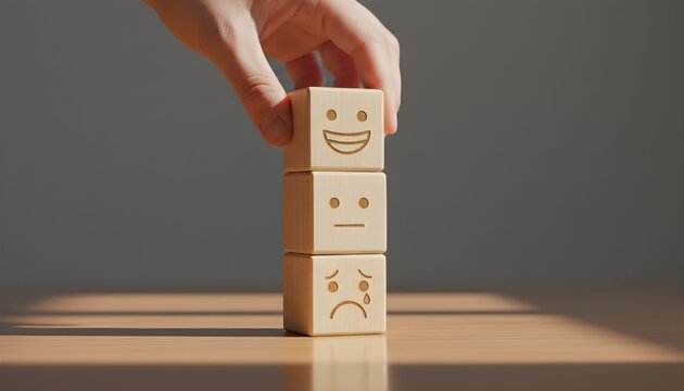 A hand places a wooden block with a smiling face on top of two blocks with different facial expressions on a table.