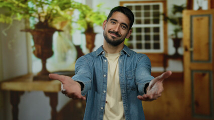 Young man with outstretched arms in a hotel room, wearing a denim shirt, conveying friendliness and warmth in an inviting indoor setting with plants.