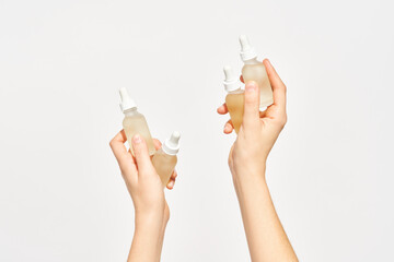 Woman Dropping Serum on Face. European Girl Applying Serum Collagen Moisturizer from Pipette on Face close up. Positive Laughing Beautiful Woman. Concept of Face Skin Care