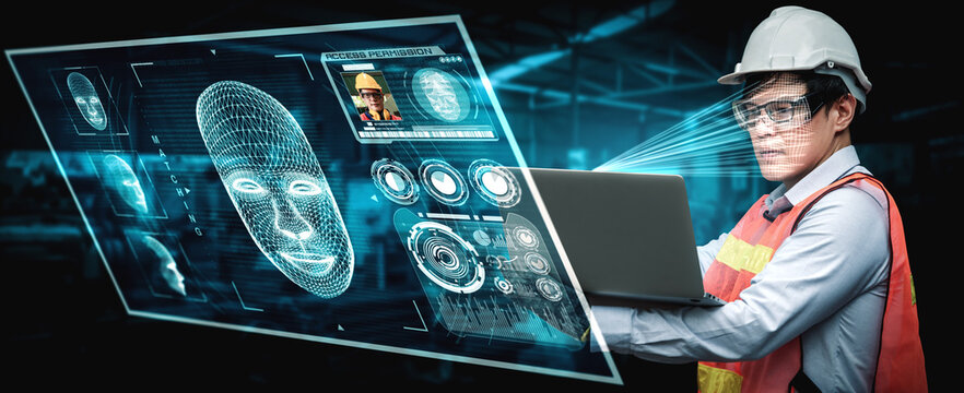 Facial recognition technology for industry worker to access machine control . Future concept interface showing digital biometric security system that analyze human face to verify personal data .