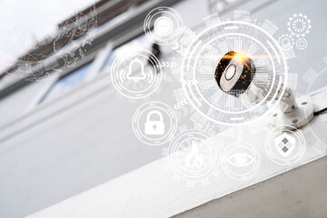 Modern CCTV on foggy day wall in city background with abstract infographics