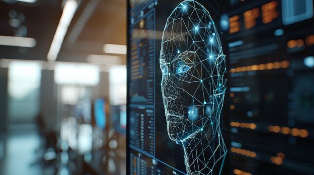 Artificial intelligence facial recognition technology displayed on a screen in a modern office setting. AI and cybersecurity innovations.