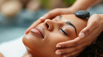 A woman lies on a table with her eyes closed, receiving a hot stone facial massage. The therapists hands gently cradle her face as a smooth, dark stone rests on her forehead.
