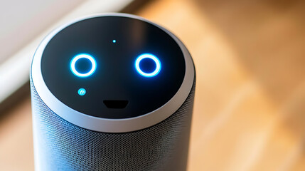 Smart speaker with glowing blue eyes and facial expression display