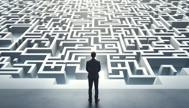 A businessman stands facing a complex pattern. It symbolizing challenges and decision-making in professional life and business too