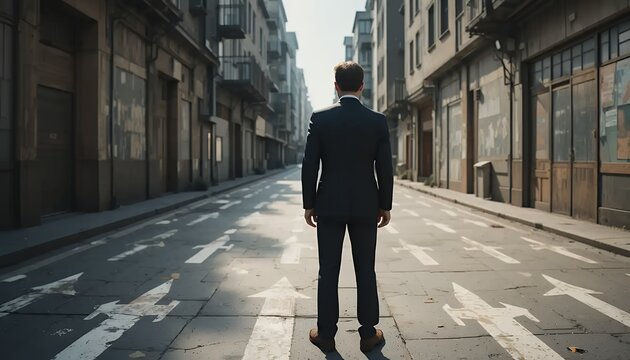 Man in Suit Standing on Street with Directional Arrows