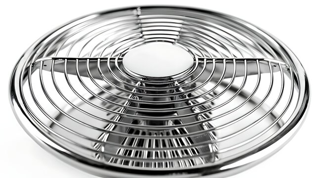 Electric fan facing forward on white background, mirrorless camera 35mm lens focusing on blade texture and circular grille with diffused studio light