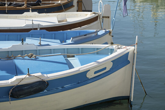peaceful marina scene with a row of small boats docked side by side, their stern facing the viewer in Cassis, Provence, France
