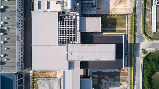 Aerial top view photo from flying drone of Power plant  Municipal Solid Waste Treatment Plant RDF Refuse Derived Fuel roof plan layout site : Generative AI