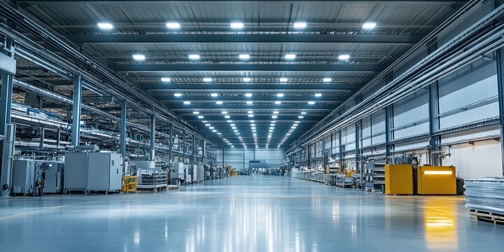 Spacious industrial warehouse with bright LED lights and clean floors, designed for storage and manufacturing processes.