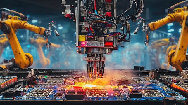 Advanced robotic arms assembling electronic circuits in high-tech factory environment with glowing sparks