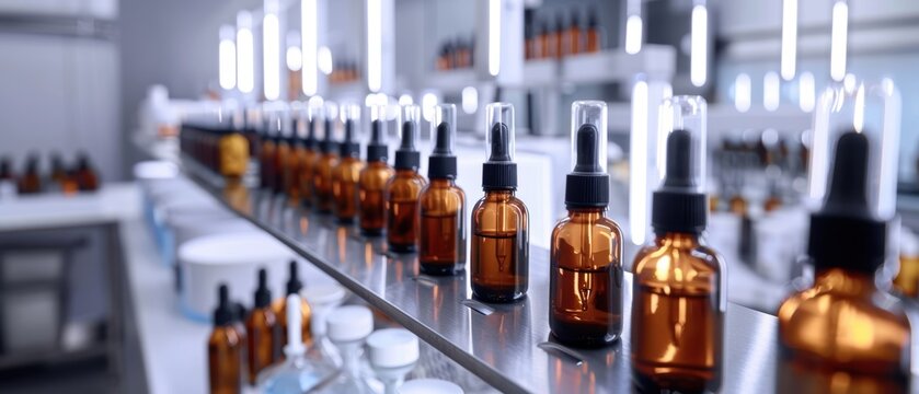 High-end cosmetic manufacturing in a sleek, modern factory with rows of amber glass dropper bottles Bright lighting and clean setup highlighting advanced production methods