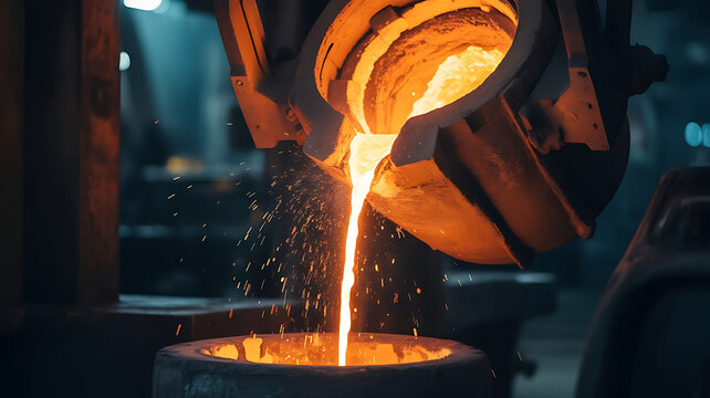 A stunning industrial scene depicting molten metal being poured into a mold, showcasing the intricate process of metalworking and manufacturing expertise.