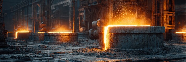 A steel foundry with glowing molten steel, ready to be cast into various shapes for industrial use.
