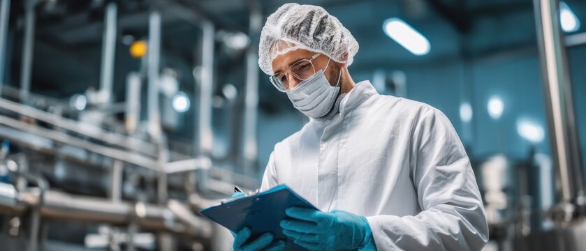 Factory worker wearing a protective helmet and mask, inspecting documents on a clipboard in an industrial manufacturing facility