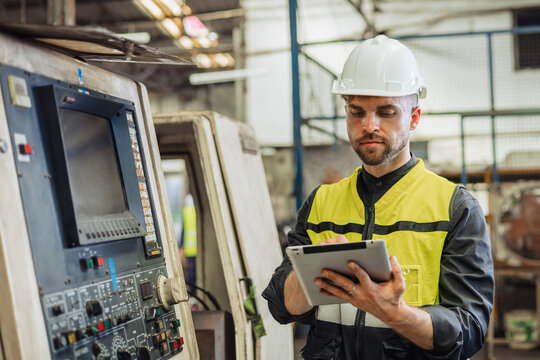 Happy Caucasian factory worker using tablet while standing in warehouse.
