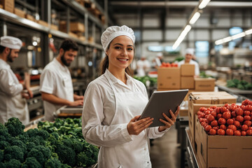 Smiling factory worker using tablet in beverage production plant
