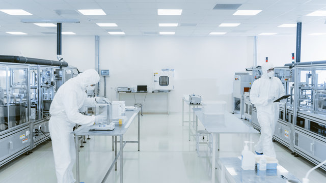 Quality Control Check: Scientist Using Digital Tablet Computer and wearing Protective Suit walks through Manufacturing Laboratory. Product Manufacturing: Pharmaceutics, Semiconductors, Biotechnology.