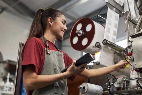 Low angle portrait of smiling female worker controlling production line of drip coffee bags, copy space