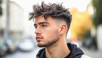 Young man with stylish fade haircut posing outdoors