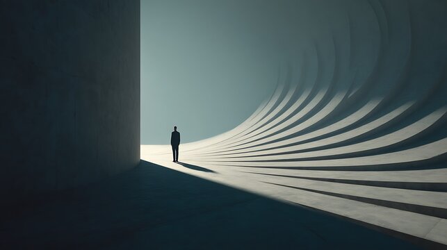 person standing at border between shadow and light, with winding geometric lines fading into clarity, elegant visual balance, v7 cinematic style