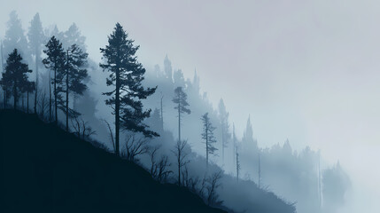 A tranquil forest shrouded in thick fog, with tall evergreen trees fading into the mist, creating a calm and mysterious ambiance.
