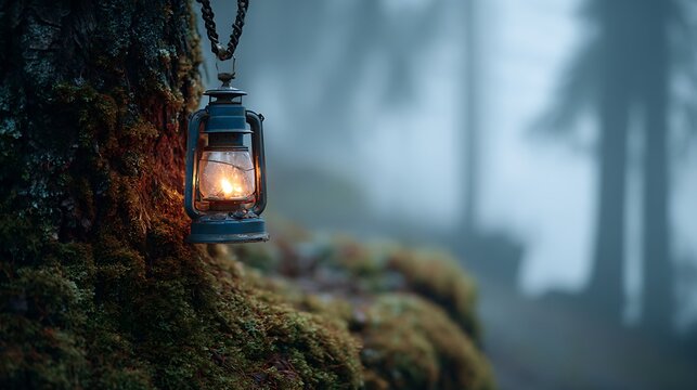 A glowing old lantern hanging beside a moss covered tree trunk light piercing through forest fog at dusk peaceful and quiet real photo stock photography