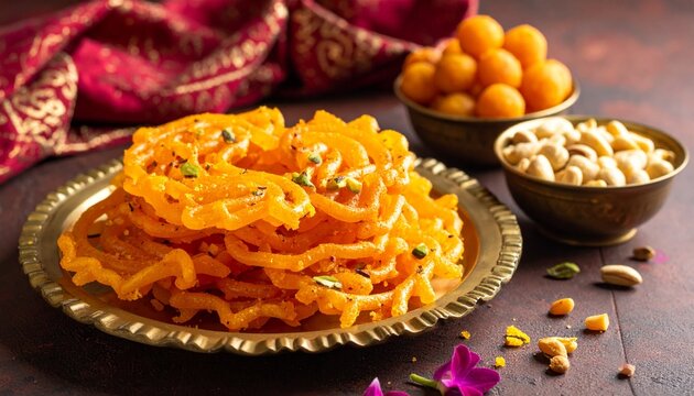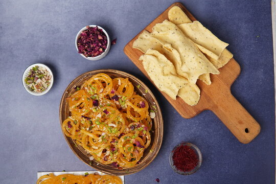Popular Indian sweet Jalebi and Fafda served with Sambhara. Gujarati snack is mostly eaten during Indian Festivals such as, Gudi Padwa, Dussehra, Eid, Diwali, Mahashivratri, Holi. with Copy space.