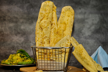 gujrati food fafda with green chilli on dark background