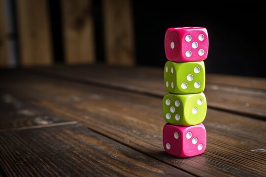 Three brightly colored wooden dice stacked vertically on a dark rustic wooden table surface with a dark background setting