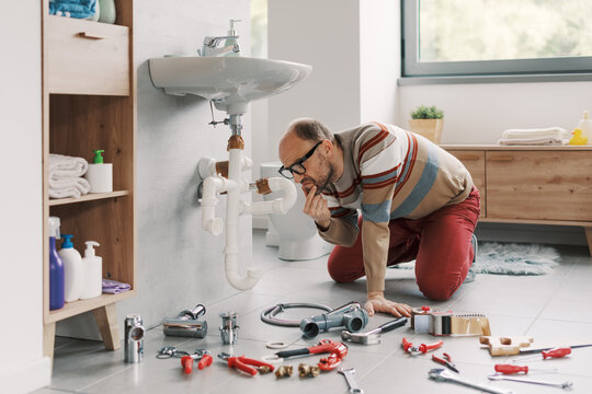 Male corporate leader buries his face in his hands due to frustration feeling the pressure of a declining economy and battling the stress of a failing company. Business downfall and bankruptcy.