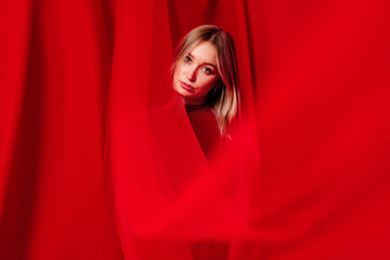 Charming fair haired lady in split of hanging red cloth