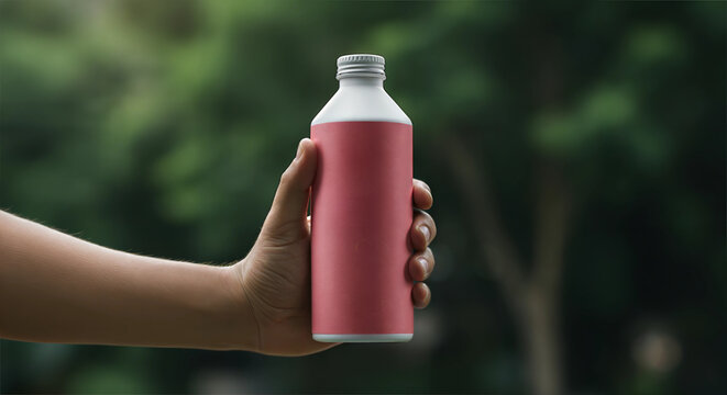A photo of a hand, appearing to be of an adult with a fair complexion, holding a red, insulated thermos-style beverage bottle with a white cap.