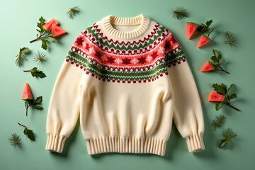Cozy cream fair isle sweater with pink and green pattern surrounded by flowers