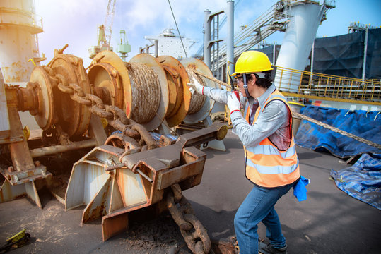 engineering or worker, motor man, loading master controller working in communication by walkie talkie to the team for safety loading winch of the crane, lifting gears operation in industrial work site