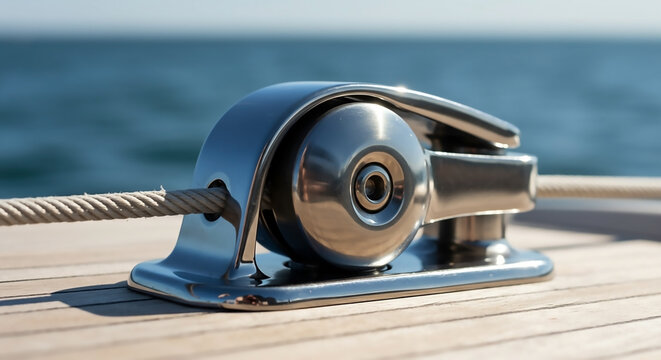 Polished Chrome Cleat and Coiled Rope on a Wooden Yacht Deck