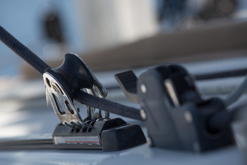 Detail of pulley, fairlead of a sport sailboat. Nautical equipment.