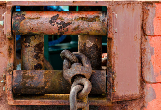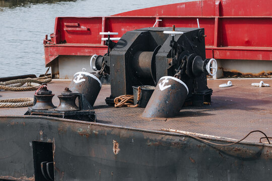 Mooring fairlead with round hole and black cast-iron ring with smooth rounding on ship.